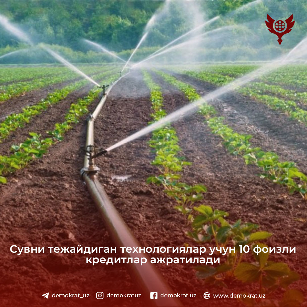 Қорақалпоғистон Республикаси ва Хоразм вилоятининг, кейинчалик эса, босқичма-босқич республиканинг барча ҳудудларининг қишлоқ хўжалиги маҳсулотлари етиштирувчиларига сувни тежайдиган технологияларни жорий қилиш учун кредитлар 10 фоиз ставкада (фоиз ставкаларини субсидиялаш ҳисобига) ажратилади.