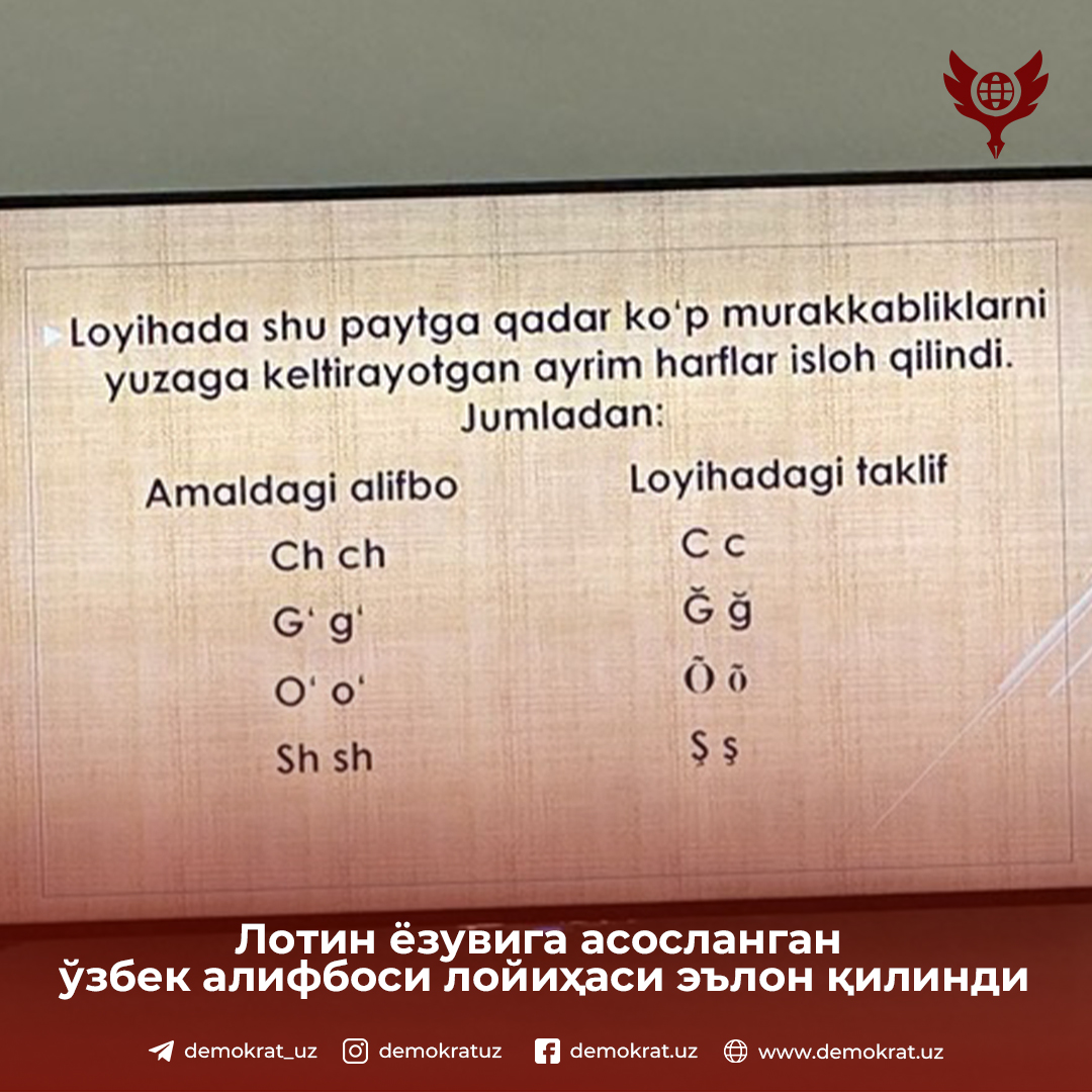 Лотин ёзувига асосланган ўзбек алифбосидаги 4 та ҳарфнинг янги шакли лойиҳаси эълон қилинди. Бу ҳақда ЎзА хабар бермоқда.