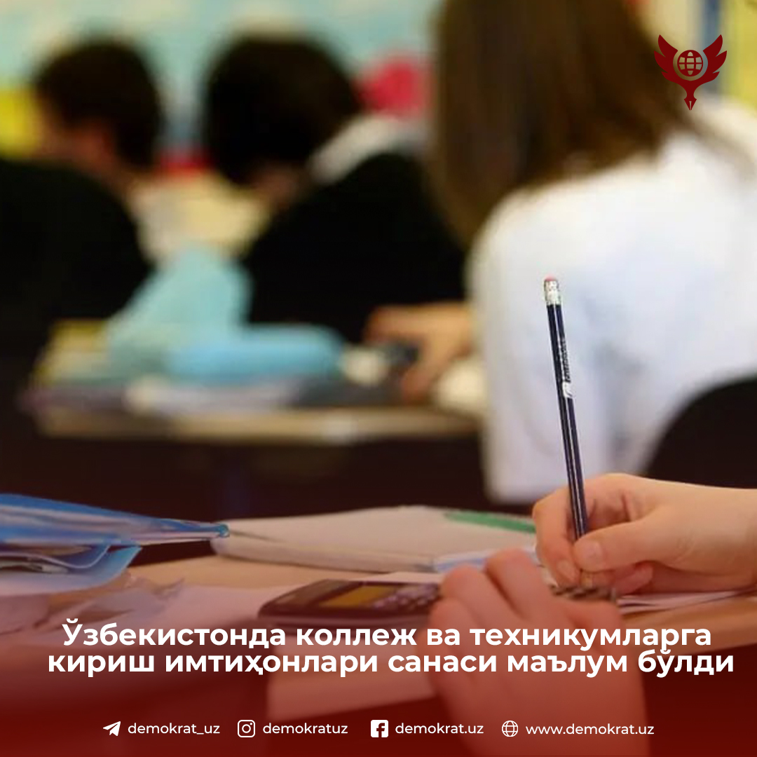 Ўзбекистондаги коллеж ва техникумларга кириш тест синовлари 26—29-сентябрь кунлари бўлиб ўтади, деб хабар қилди Олий таълим, фан ва инновациялар вазирлиги.