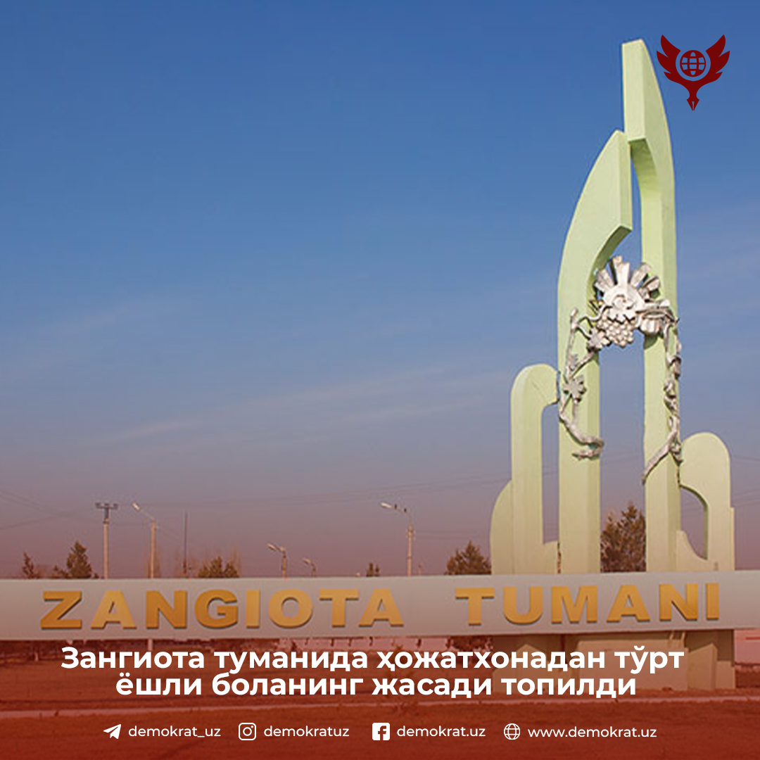 Бош прокуратуранинг маълум қилишича, Тошкент вилояти Зангиота туманида уй ҳожатхонасидан ёш боланинг жасади топилди. Унга кўра, 1 октябр куни Зангиота туманида жойлашган бир уйнинг ҳожатхонасида тахминан 4-5 ёшли эркак жинсига мансуб мурда топилган. Ҳозирда Жиноят кодексининг 97-моддаси билан жиноят иши қўзғатилган. Тергов олиб борилмоқда.