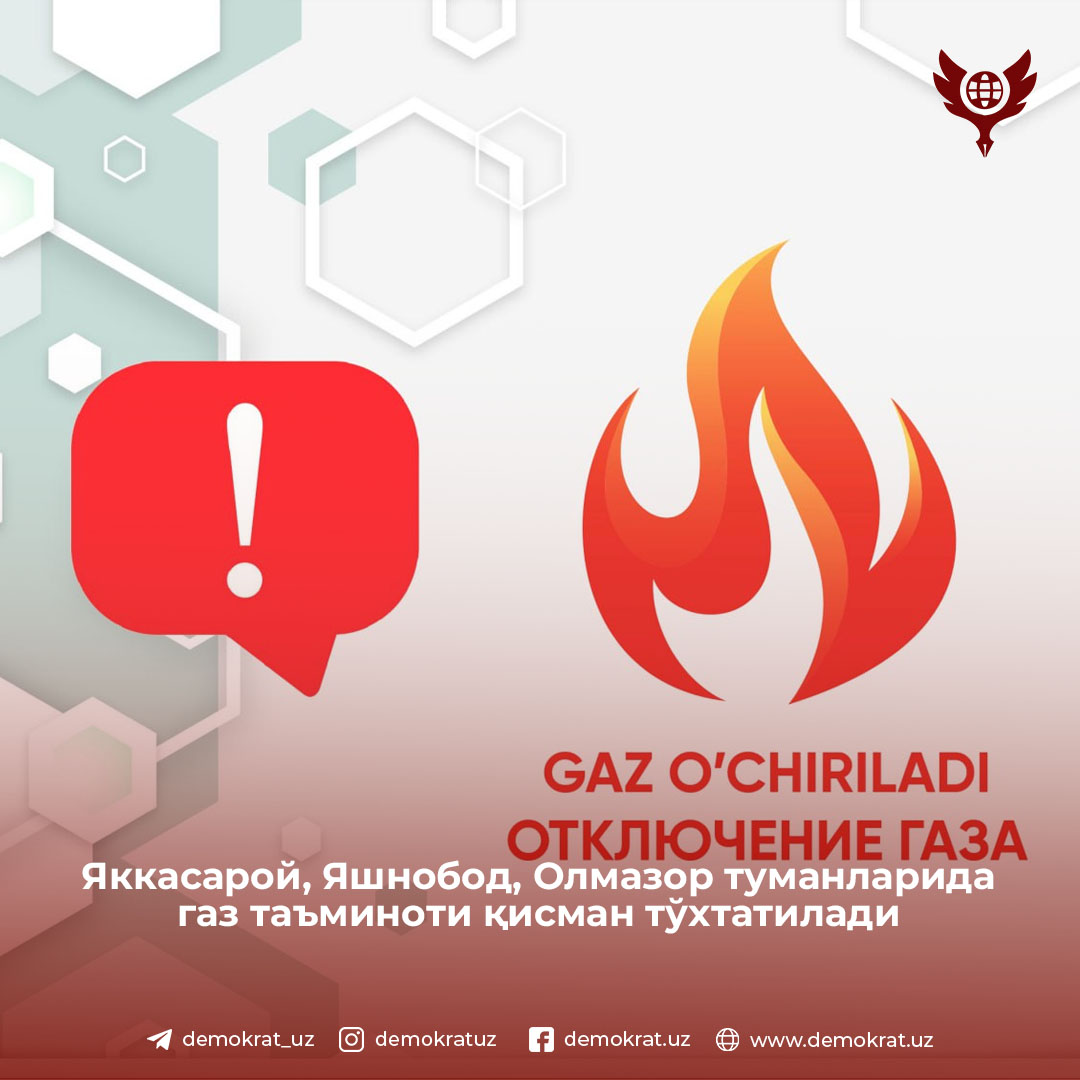 Куз-қиш мавсумига тайёргарлик ишлари доирасида пойтахтимизнинг Яккасарой, Яшнобод, Олмазор туманлари газ таъминоти тизимида таъмирлаш ва созлаш ишлари олиб борилади. Шу муносабат билан ушбу туманларнинг баъзи маҳалла ва кўчаларида 26 октябрь куни газ таъминоти тўхтатилади. Бу Тошкент шаҳар ҳокимлиги маълум қилди.