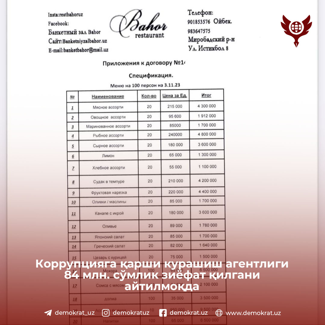 Коррупцияга қарши курашиш агентлиги «Баҳор» ресторанида 84 млн. сўмлик кечки зиёфат ўтказган.