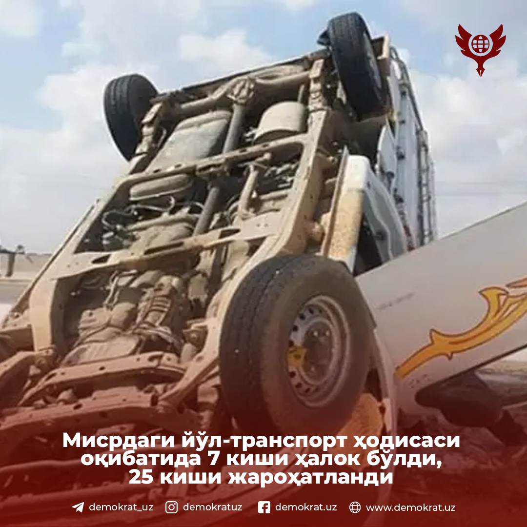 Сешанба куни Миср жанубидаги Эль-Минья губернаторлиги йўлида автобус иштирокида содир бўлган йўл-транспорт ҳодисаси оқибатида 7 киши ҳалок бўлди, 25 киши жароҳат олди, деб хабар бермоқда Синьхуа.