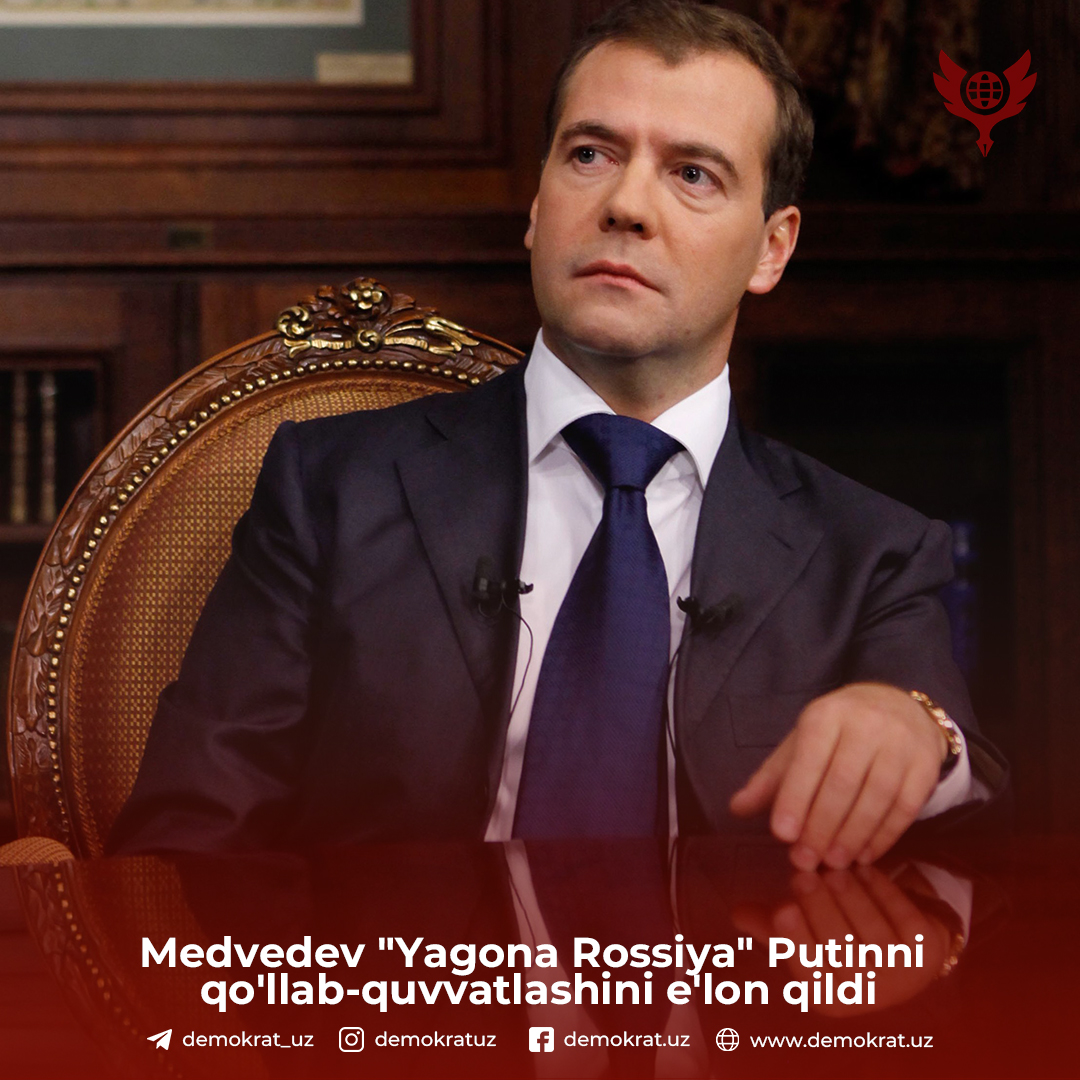 «Yagona Rossiya» raisi Dmitriy Medvedev prezident sifatida Vladimir Putinni partiyaning barcha a’zolari qo’llab-quvvatlashiga ishontirdi. Uning so‘zlariga ko‘ra, partiya mamlakatni kim boshqarishi kerakligiga shubha qilmaydi. Medvedevning so’zlarini RIA Novosti keltirmoqda.