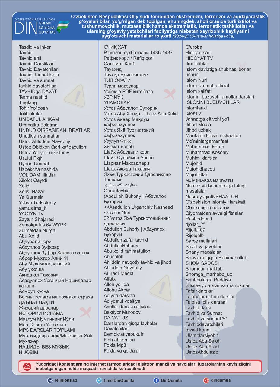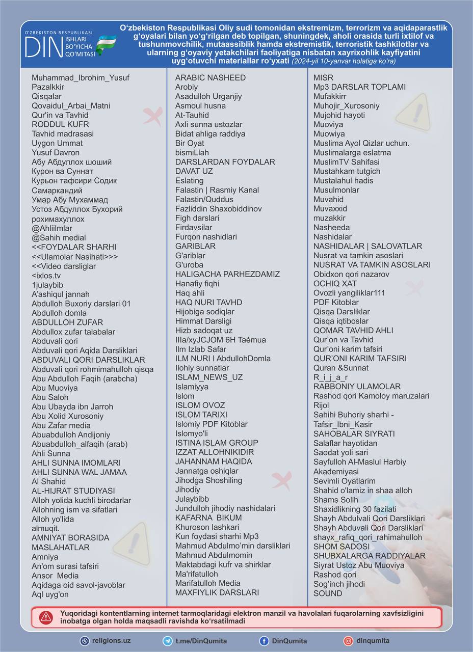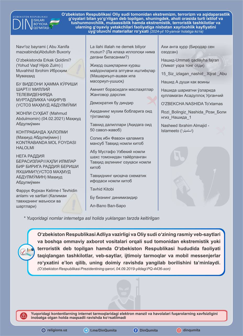 Oʻzbekiston Oliy sudi tomonidan ekstremizm va terrorizm gʻoyalari bilan yoʻgʻrilgan deb topilgan, respublika hududiga olib kirish, tayyorlash, tarqatish va namoyish etish taqiqlangan materiallar roʻyxati eʼlon qilindi.