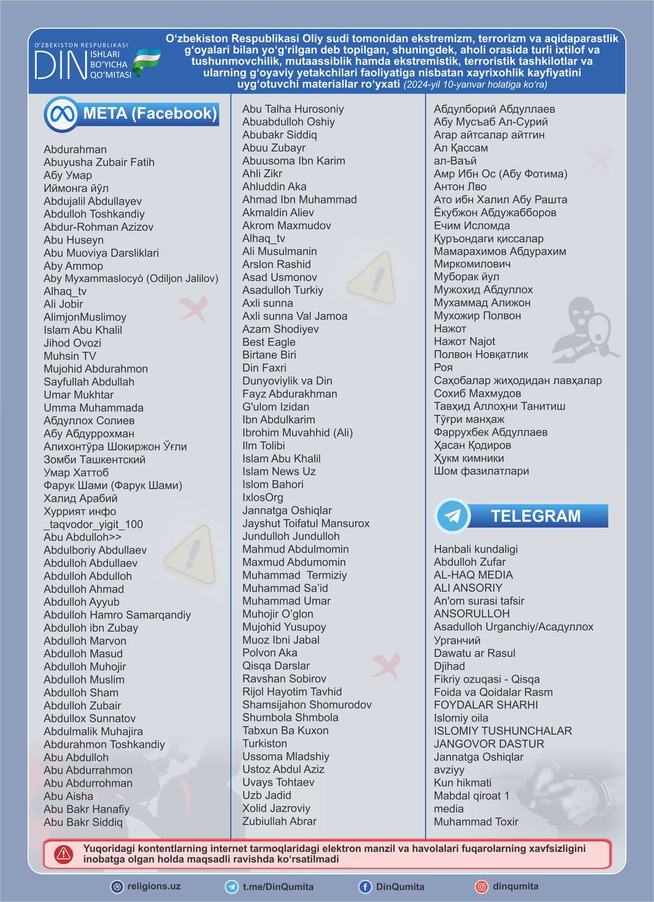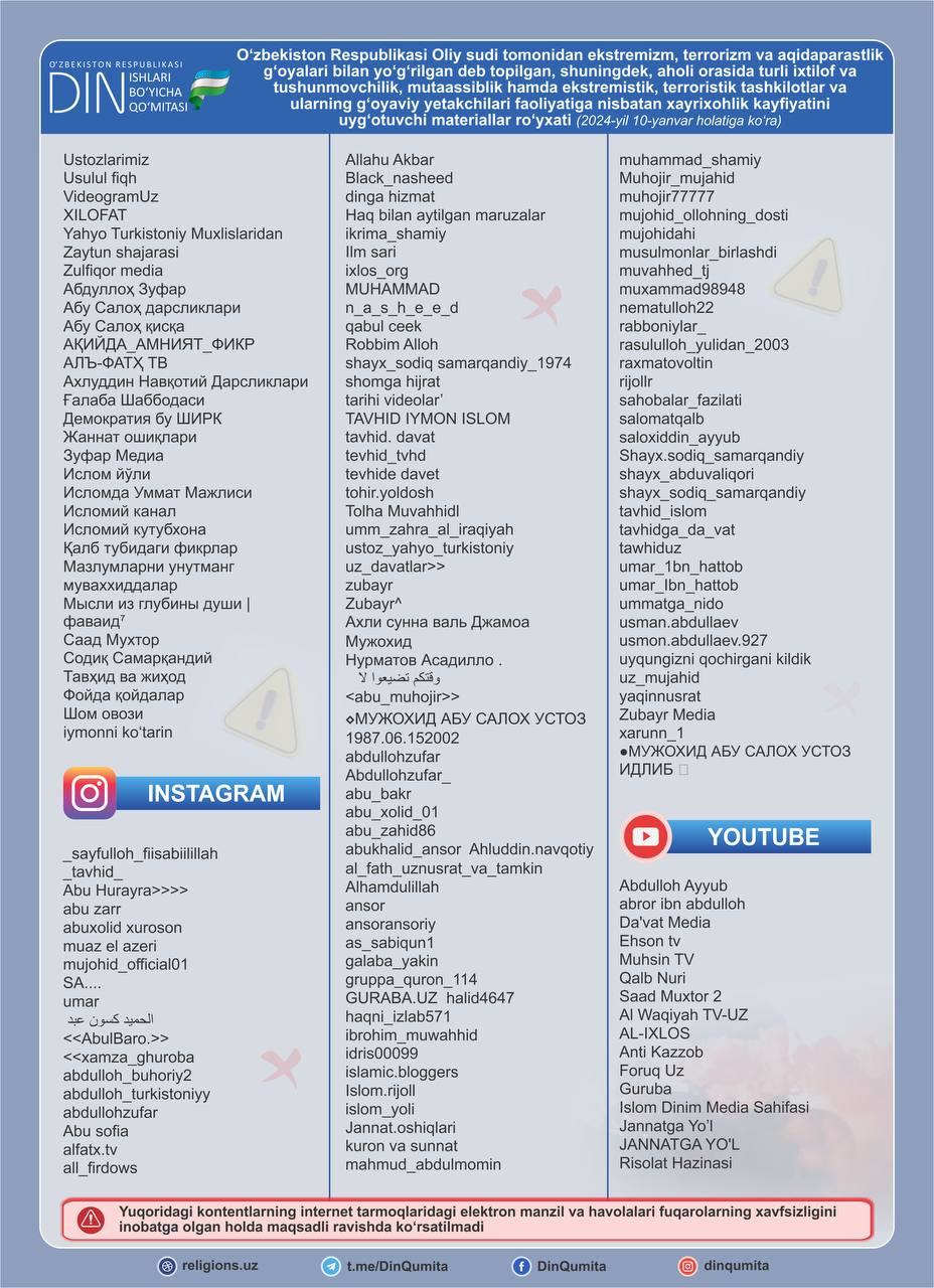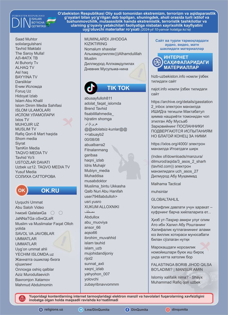 Oʻzbekiston Oliy sudi tomonidan ekstremizm va terrorizm gʻoyalari bilan yoʻgʻrilgan deb topilgan, respublika hududiga olib kirish, tayyorlash, tarqatish va namoyish etish taqiqlangan materiallar roʻyxati eʼlon qilindi.