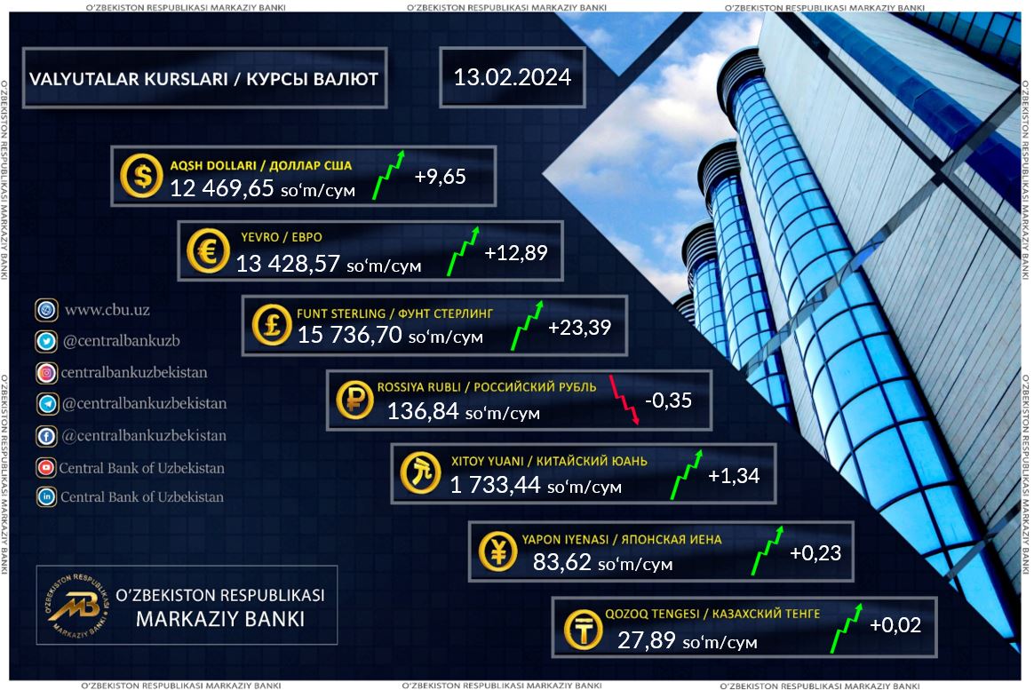 Maʼlumotga koʻra, dollarning rasmiy kursi 9,65 soʻmga koʻtarilib, 13-fevraldan boshlab 12 469,65 soʻmni tashkil etadi.
