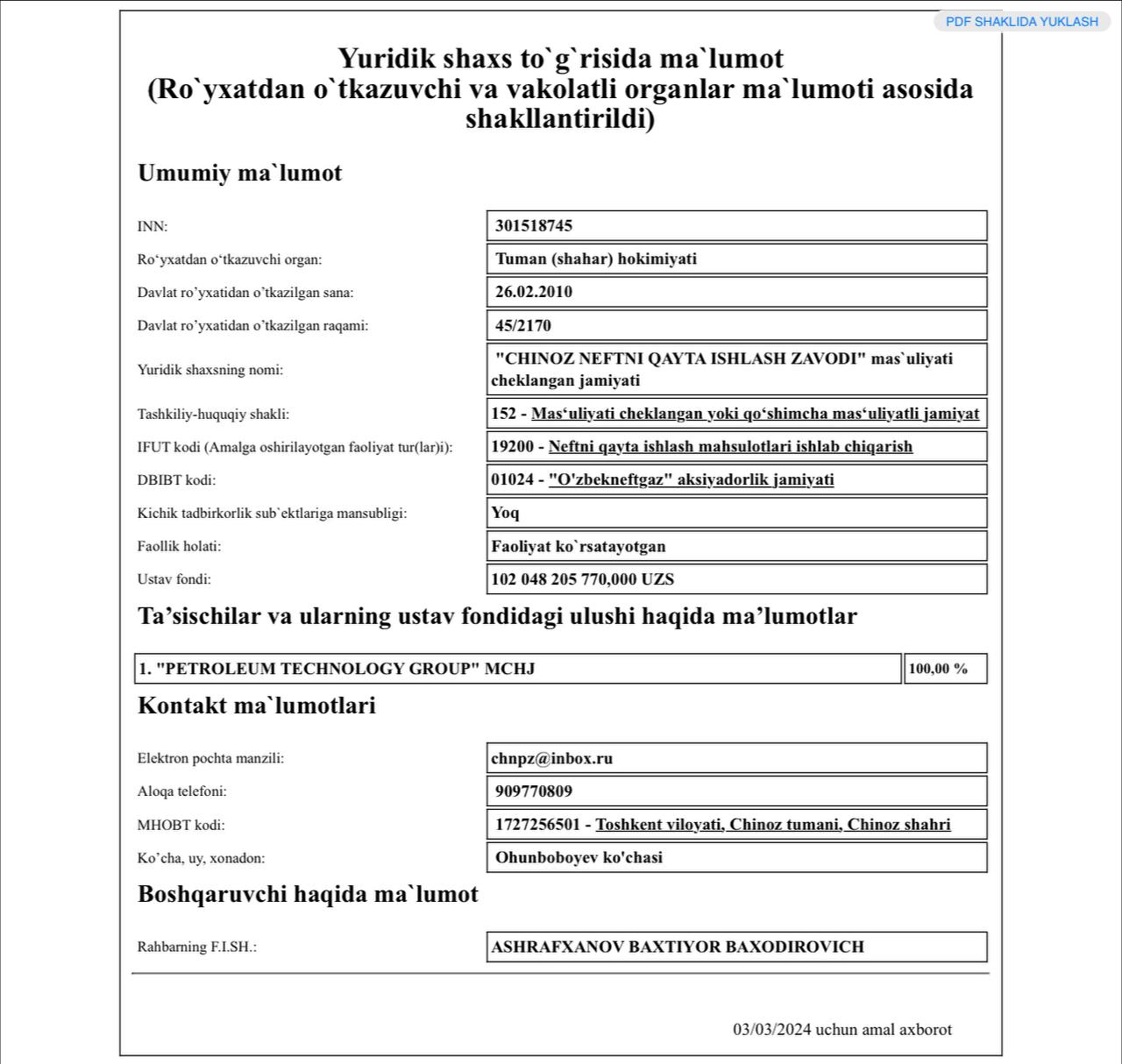 “Chinoz neftni qayta ishlash zavodi” MCHJ ham xususiylashtirildi. Xaridor UNG Petro AYOQSHlarini xarid qilgan Petroleum Technology Group MCHJ.