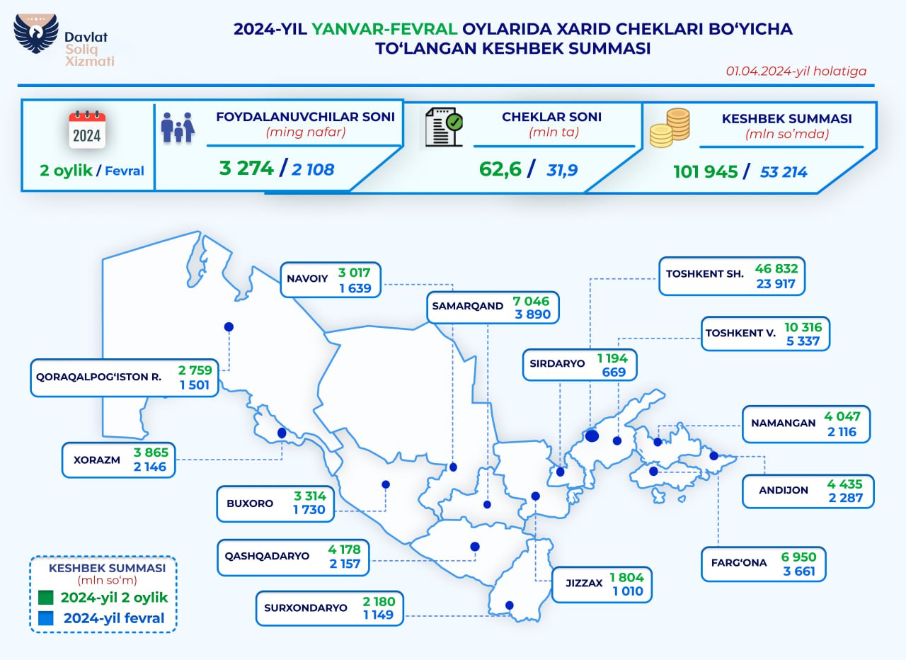 2024-yil boshidan (1-aprel holatiga) isteʼmolchilarga 62,6 mln chek uchun 101,6 mlrd soʻm keshbek toʻlangan. Shundan 53,2 mlrd soʻmi fevral oyida berilgan.