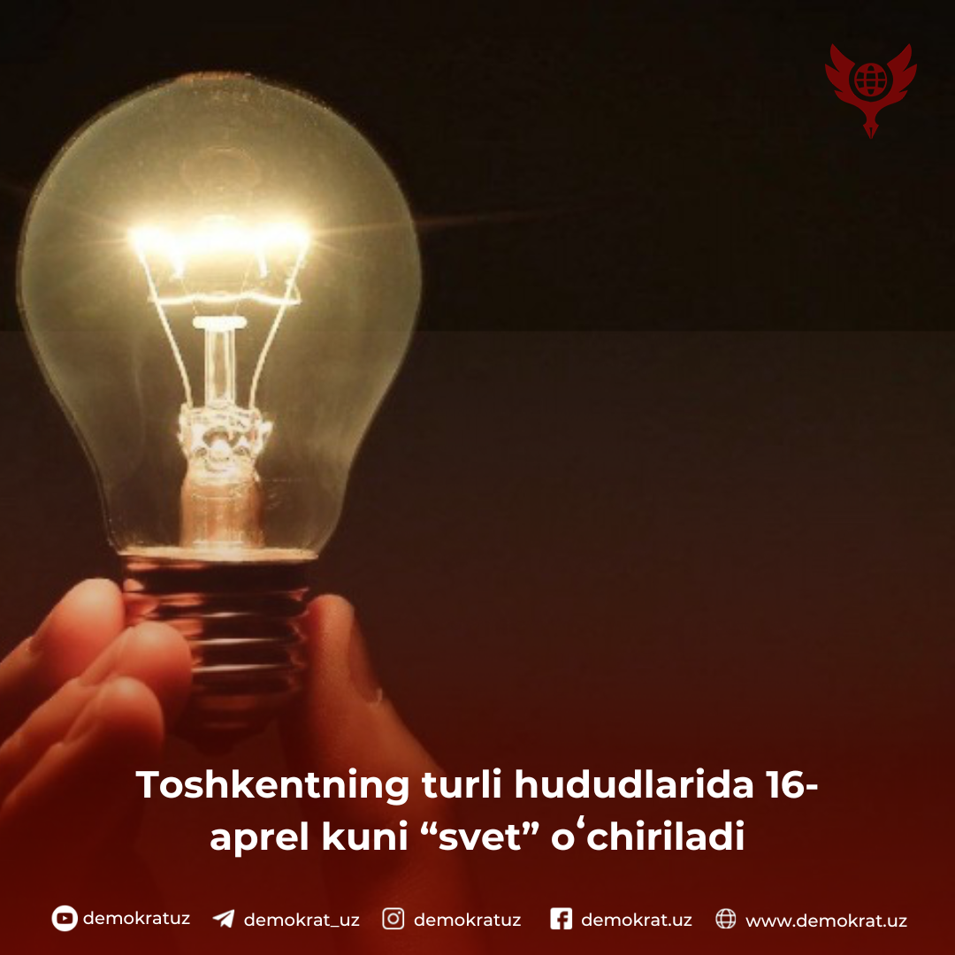 Isteʼmolchilarga sifatli va barqaror elektr energiyasi yetkazib berilishini taʼminlash va elektr tarmoqlaridagi avariyaviy holatlarni oldini olish hamda mavjud elektr qurilmalarida taʼmirlash ishlarini olib borish maqsadida ertaga, 16-aprel kuni quyidagi manzillarda elektr taʼminoti vaqtincha oʻchiriladi: