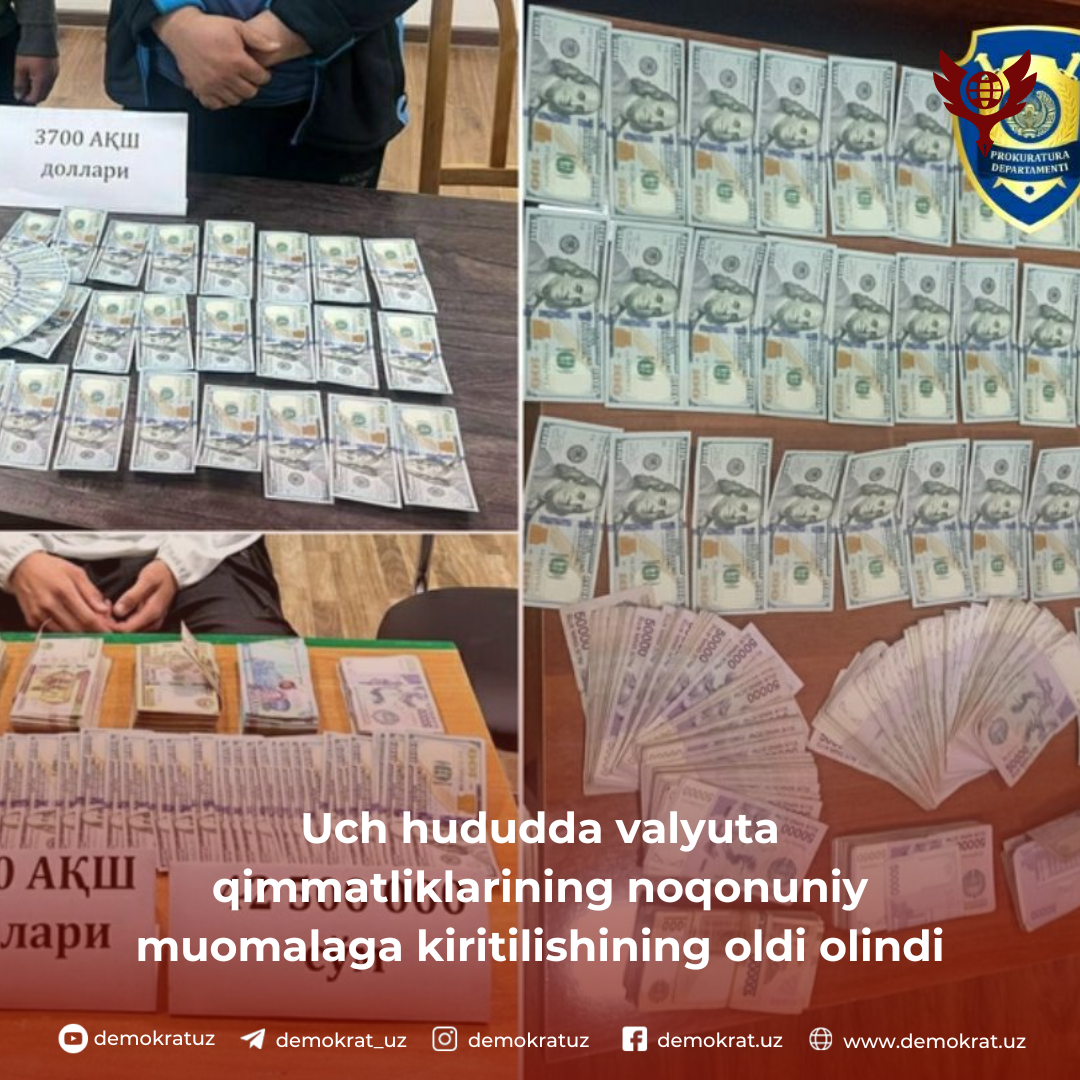 Bosh prokuratura huzuridagi Departamentning Kegeyli va Qonlikoʻl tumani boʻlimlari tomonidan DXX xodimlari bilan hamkorlikda oʻtkazilgan tezkor tadbirlarda valyuta ayirboshlash bilan shugʻullanib kelgan P.Q. va B.K. fuqarolar S.D. va D.B.dan jami 6 800 AQSH dollarini 85,4 mln soʻmga sotib olgan vaqtlarida ashyoviy dalillar bilan ushlangan.