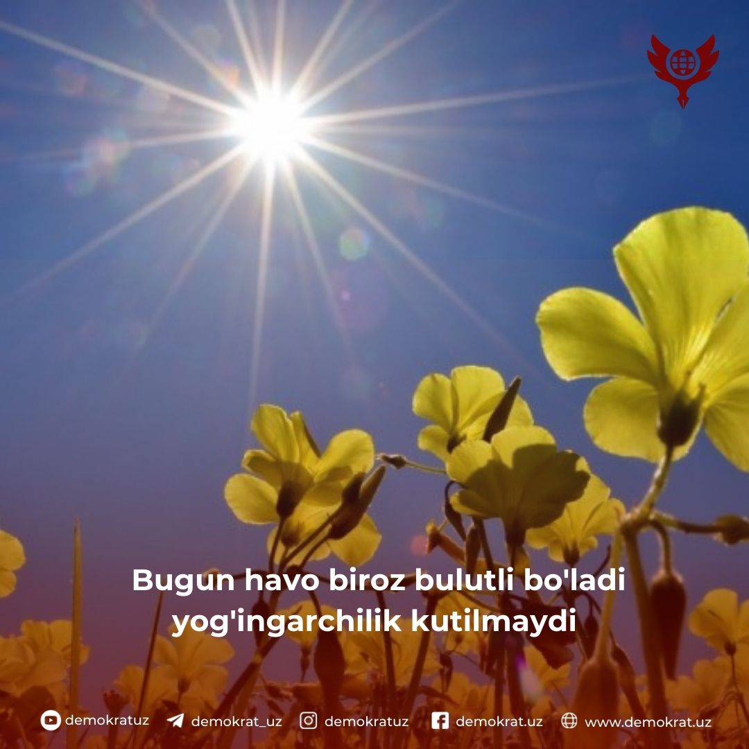 Havo biroz bulutli bo‘ladi, yog‘ingarchilik kutilmaydi. Shamol sharqdan 5-10 m/s tezlikda esadi. Harorat kechasi 5-10° iliq, kunduzi 20-25° bo‘ladi