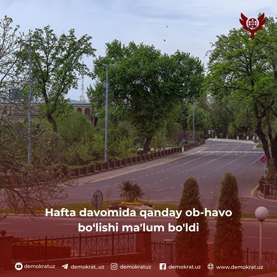 Shuningdek, Toshkent, Samarqand, Jizzax va Sirdaryo viloyatlarida havo biroz bulutli bo‘ladi, yog‘ingarchilik kutilmaydi, faqat 25 aprelda ba’zi joylarda qisqa muddatli yomg‘ir yog‘ishi, momaqaldiroq bo‘lishi mumkin. Shamol sharqdan 7-12 m/s tezlikda esadi. Harorat 24 aprelda kechasi 12-17 daraja, kunduzi 24-29 daraja; 25 aprelda kechasi 14-19 daraja, kunduzi 24-29 daraja; 26 aprelda kechasi 12-17 daraja, kunduzi 22-27 daraja bo‘ladi.