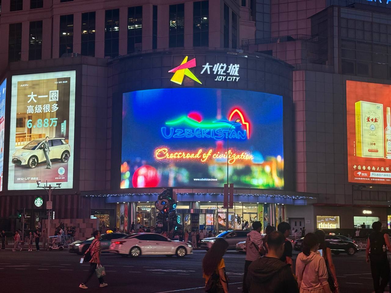 Pekin va Tyanjinning markaziy ko‘chalaridagi eng yirik LED ekranlarda O‘zbekistonning betakror sayyohlik yo‘nalishlari va boy madaniy merosi aks etgan 15 soniyalik rang-barang videoroliklar muntazam namoyish etilmoqda.